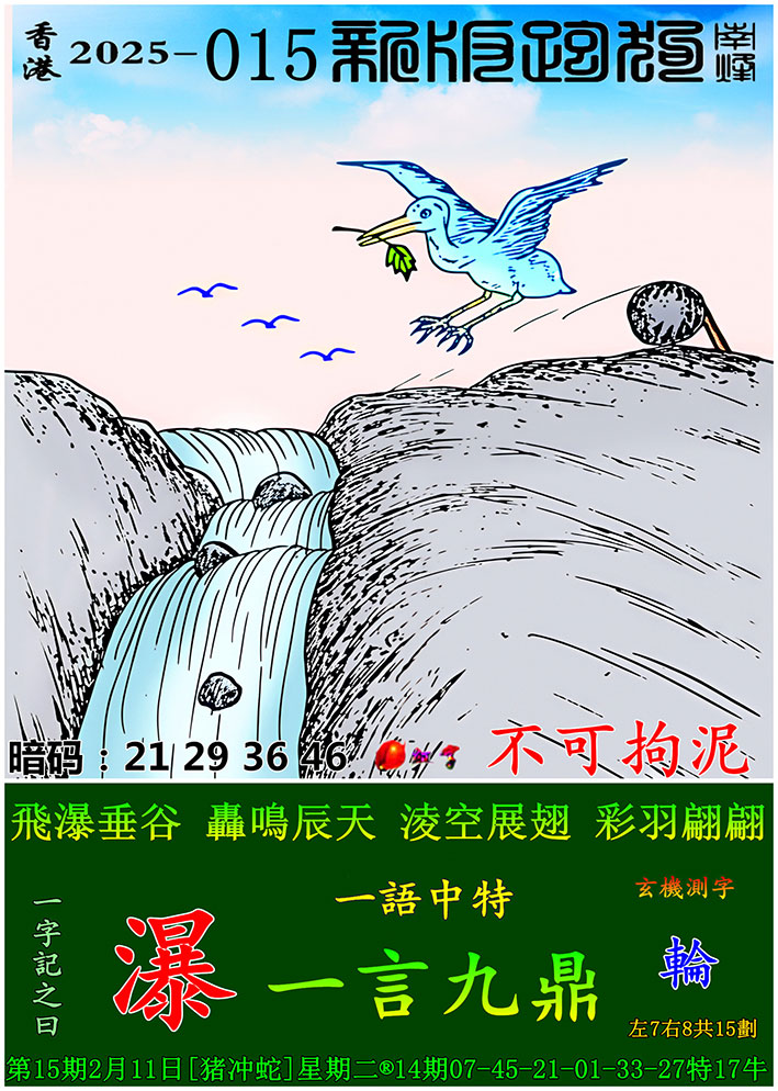 015期:新版跑狗一字記之曰【瀑】 玄機測字:【輪】