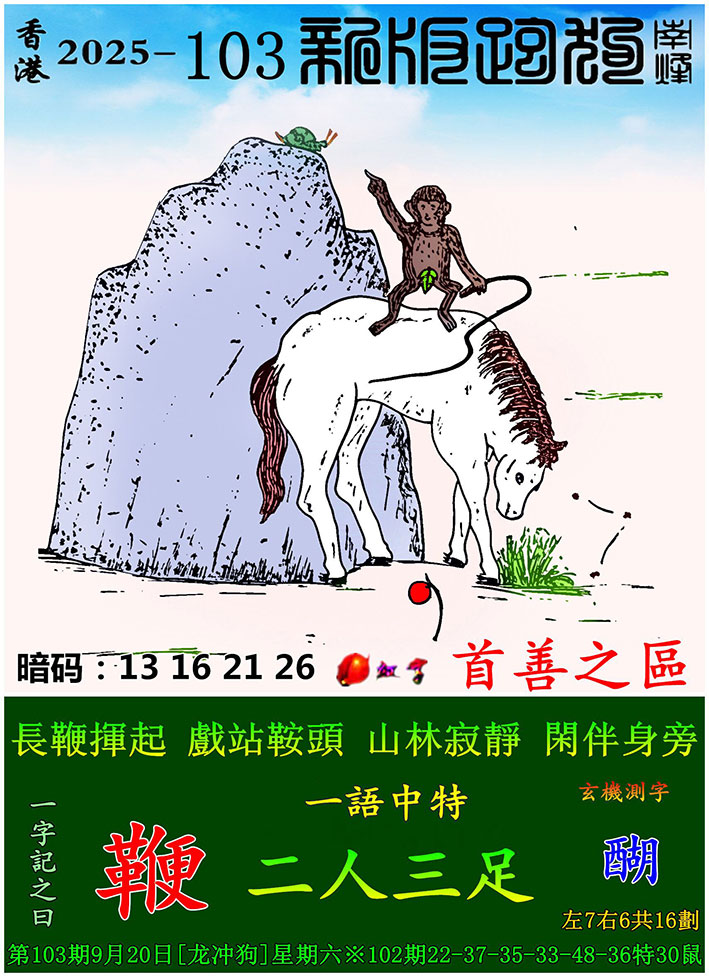 103期:新版跑狗一字記之曰【鞭】 玄機測字:【醐】