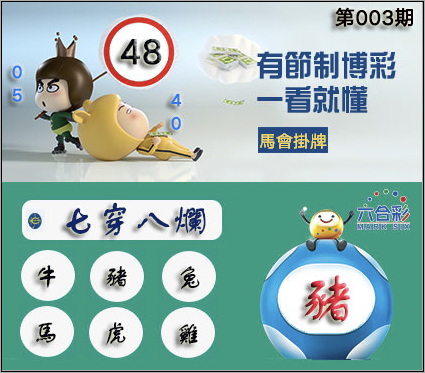 003期正版彩图挂:48 爆:猪 挂牌成语:七穿八烂 挂牌出肖:牛猪兔马虎鸡