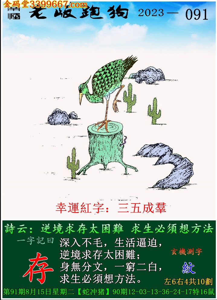 091期老版跑狗一字記之曰:【存】 玄機測字:《紋》