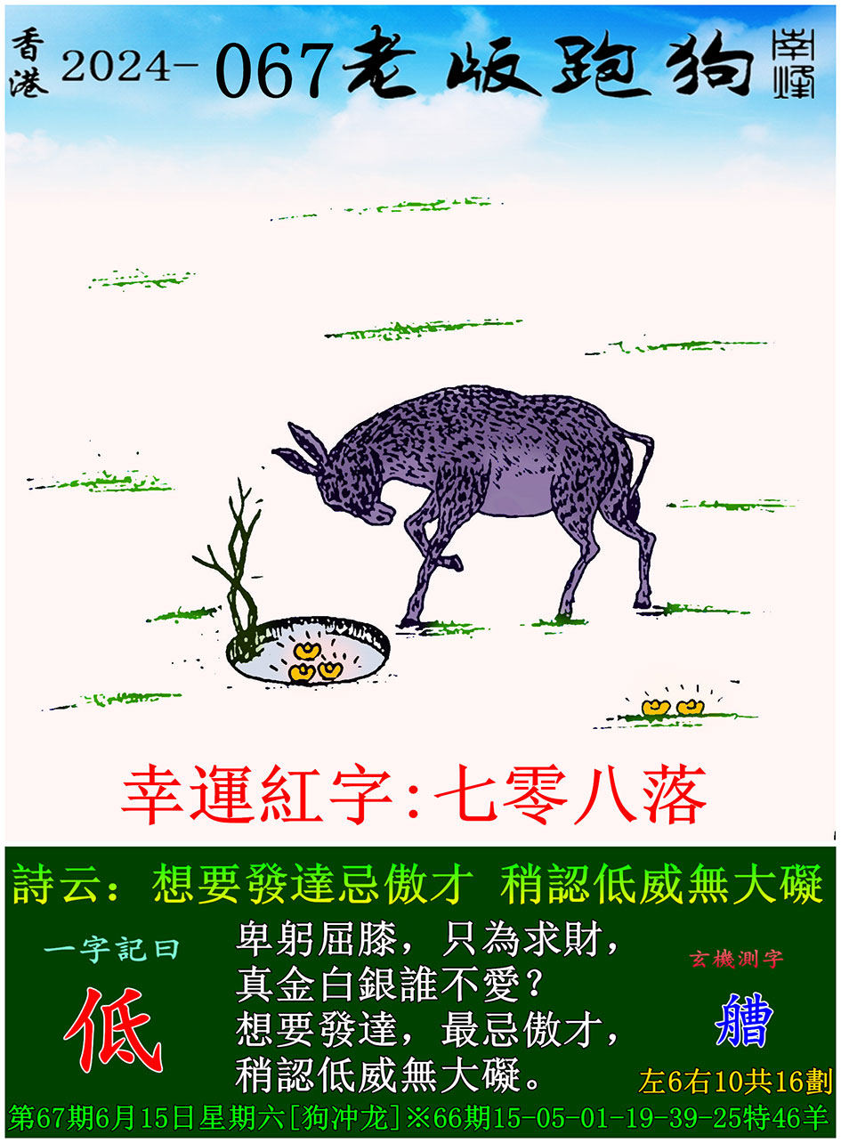 067期老版跑狗一字記之曰:【低】