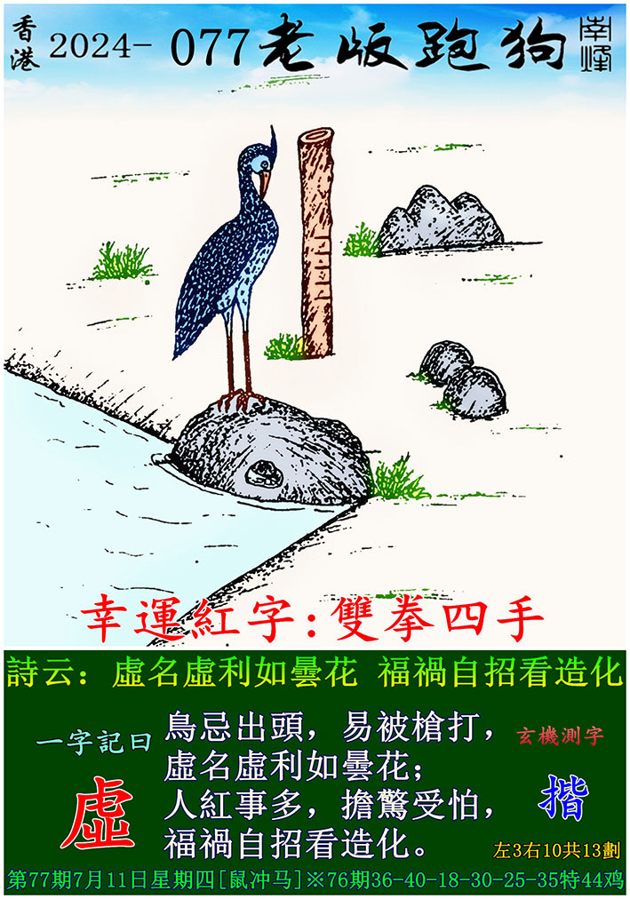 077期老版跑狗一字記之曰:【虛】 玄機測字:《揩》