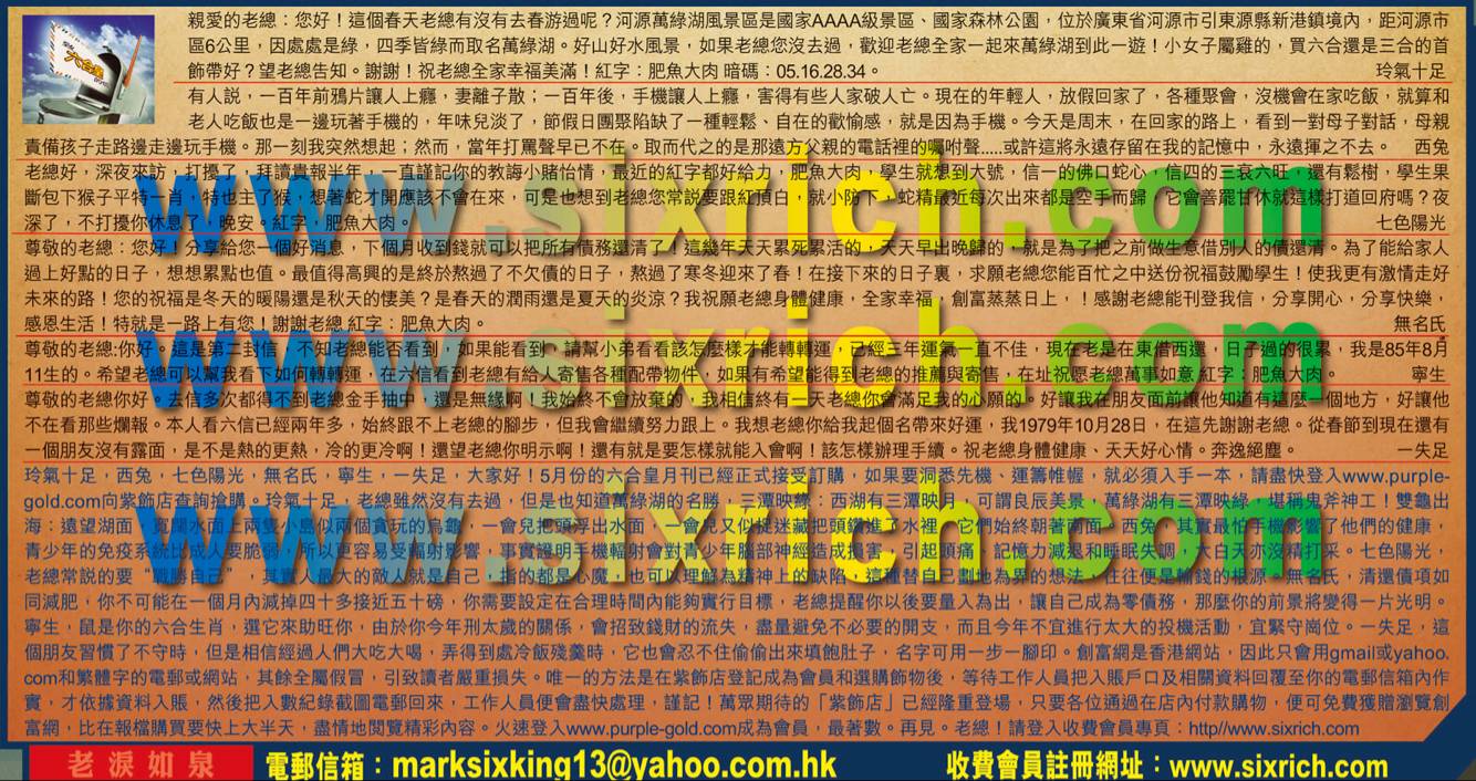 【6】尊敬的老總你好!去信多次都得不到老總金手抽中,還是無缘啊!我始终不會放棄的,我相信終有一天老總你會滿足我的心願的,好讓我在朋友面前讓他知道有這麼一個地方,好讓他不在看那些爛報。本人看六信已經兩年多,始終跟不上老總的腳步,但我會繼續努力跟上。我想老總你给我起個名帶來好運,我1979年10月28日,在這先謝謝老總。從春節到現在還有一個朋友沒有露面是不是熱的更熱,冷的更冷啊!還望老總你明示啊!還有就是要怎樣就能入會啊!該怎樣辦理手續。祝老總身體健康、天天好心情。奔逸絕塵。  ---一失足