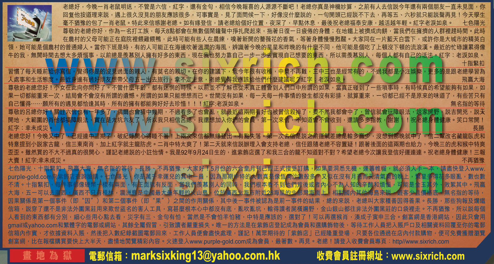 →〖長勝〗那些狗報及爛鐵信箱,說穿了還不是非法外圍黑莊用來欺世盜名的害人工具,寫甚麼根本心中都沒有底,亂吹亂坑,輸得讀者屍橫遍野,金山銀山都往非法外圍黑莊的口袋裡走。