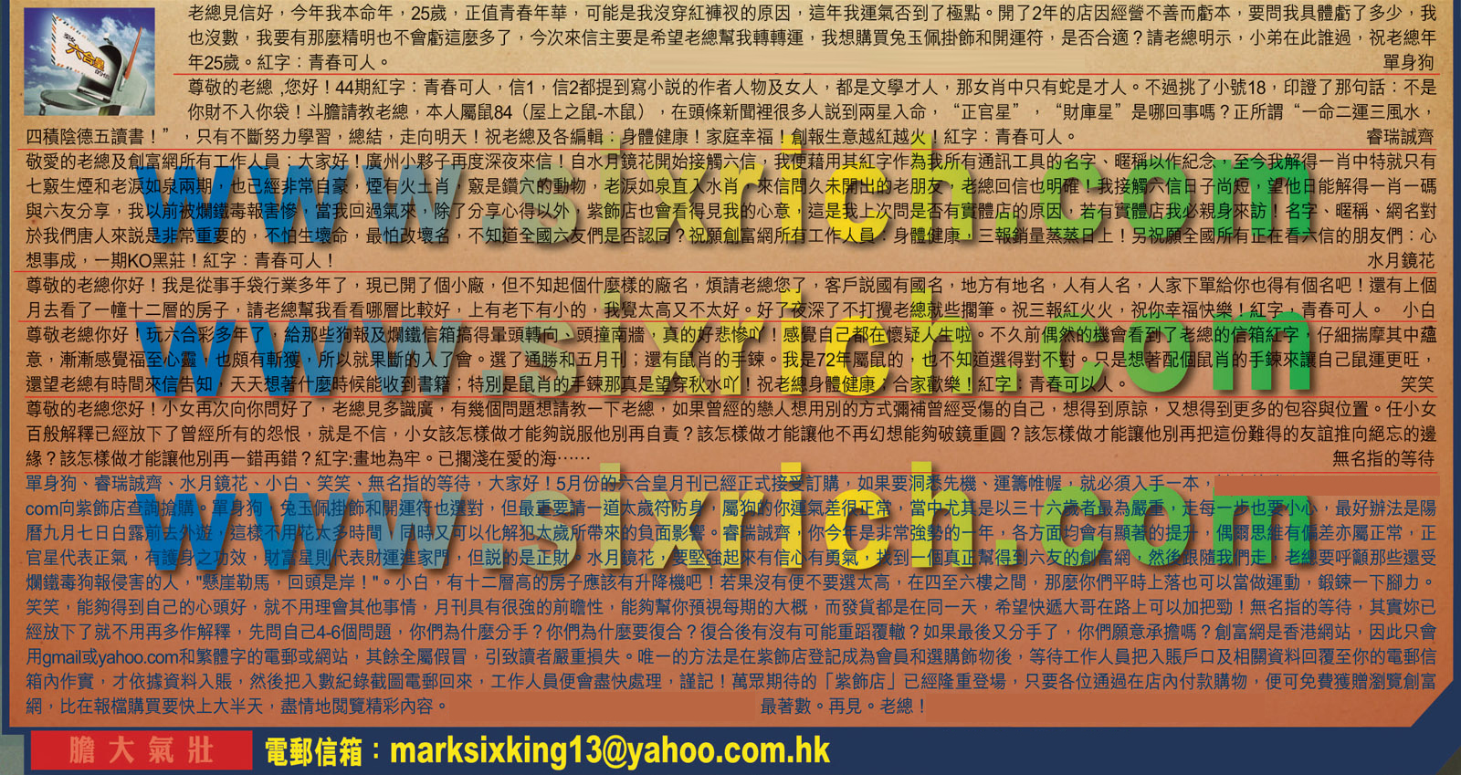 【3】敬愛的老總及創富網所有工作人員:大家好!廣州小夥子再度深夜來信! 自水月镜花開始接觸六信,我便藉用其紅字作為我所有通訊工具的名字、暱稱以作紀念,至今我解得一肖中特就只有七竅生煙和老淚如泉两期,也已經非常自豪,煙有火士肖,竅是鑽穴的動物,老淚如泉直入水肖來信問久未開出的老朋友,老總回信也明確!我接觸六信日子尚短,望他日能解得一肖一碼與六友分享,我以前被爛鐵毒報害惨,當我回過氣求,除了分享心得以外,紫飾店也會看得見我的心意,這是我上次問是否有實體店的原因,若有實體店我必親身來訪!名字、暱稱、網名對於我們唐人來說是非常重要的,不怕生壤命,最怕改壞名,不知道全國六友們是否認同?祝願創富網所有工作人員、身體健康,三報銷量蒸蒸日上!另祝願全國所有正在看六信的朋友們:心想事成,一期KO黑莊!紅字:青春可人! ---水月鏡花