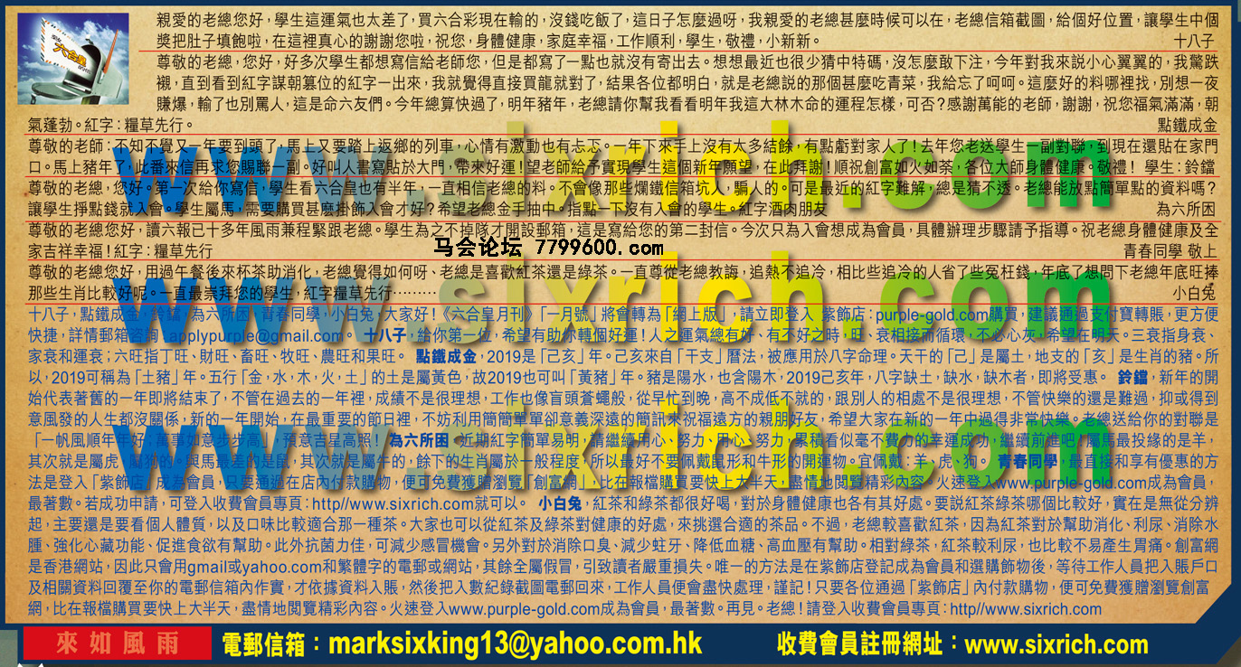 【2】尊敬的老總,您好,好多次學生都想寫信給老師您,但是都寫了一點也就沒有寄出去。想想最近也很少猜中特碼,沒怎麼敢下注.今年對我來說小心翼翼的,我驚跌襯,直到看到紅字謀朝篡位的紅字一出來,我就覺得直接買龍就對了,結果各位都明白,就是老總說的那個甚麼吃青菜,我給忘了呵呵。這麼好的料哪裡找,別想一夜賺爆,輸了也別罵人,這是命六友們。今年總算快過了,明年豬年,老總請你幫我看看明年我這大林木命的運程怎樣,可否?感謝萬能的老師,謝謝,祝您福氣滿滿,朝氣蓬勃。紅字:糧草先行。 ---點鐵成金