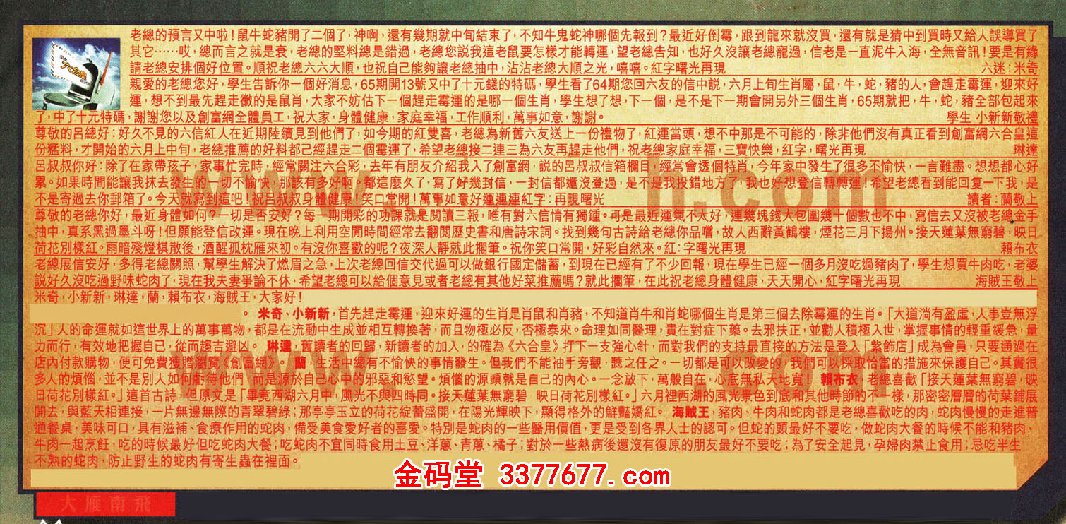 【1】老總的預言又中啦!鼠牛蛇豬開了二個了,神啊,還有幾期就中旬結束了,不知牛鬼蛇神哪個先報到?最近好倒霉,跟到龍來就沒買,還有就是猜中到買時又給人誤導買了其它……哎.,總而言之就是衰,老總的堅料總是錯過,老總您說我這老鼠要怎樣才能轉運,望老總告知,也好久沒讓老總寵過,信老是一直泥牛入海,全無音訊!要是有緣請老總安排個好位置。順祝老總六六大順,也祝自己能夠讓老總抽中,沾沾老總大順之光嘻嘻。紅字曙光再現 ---六迷:米奇