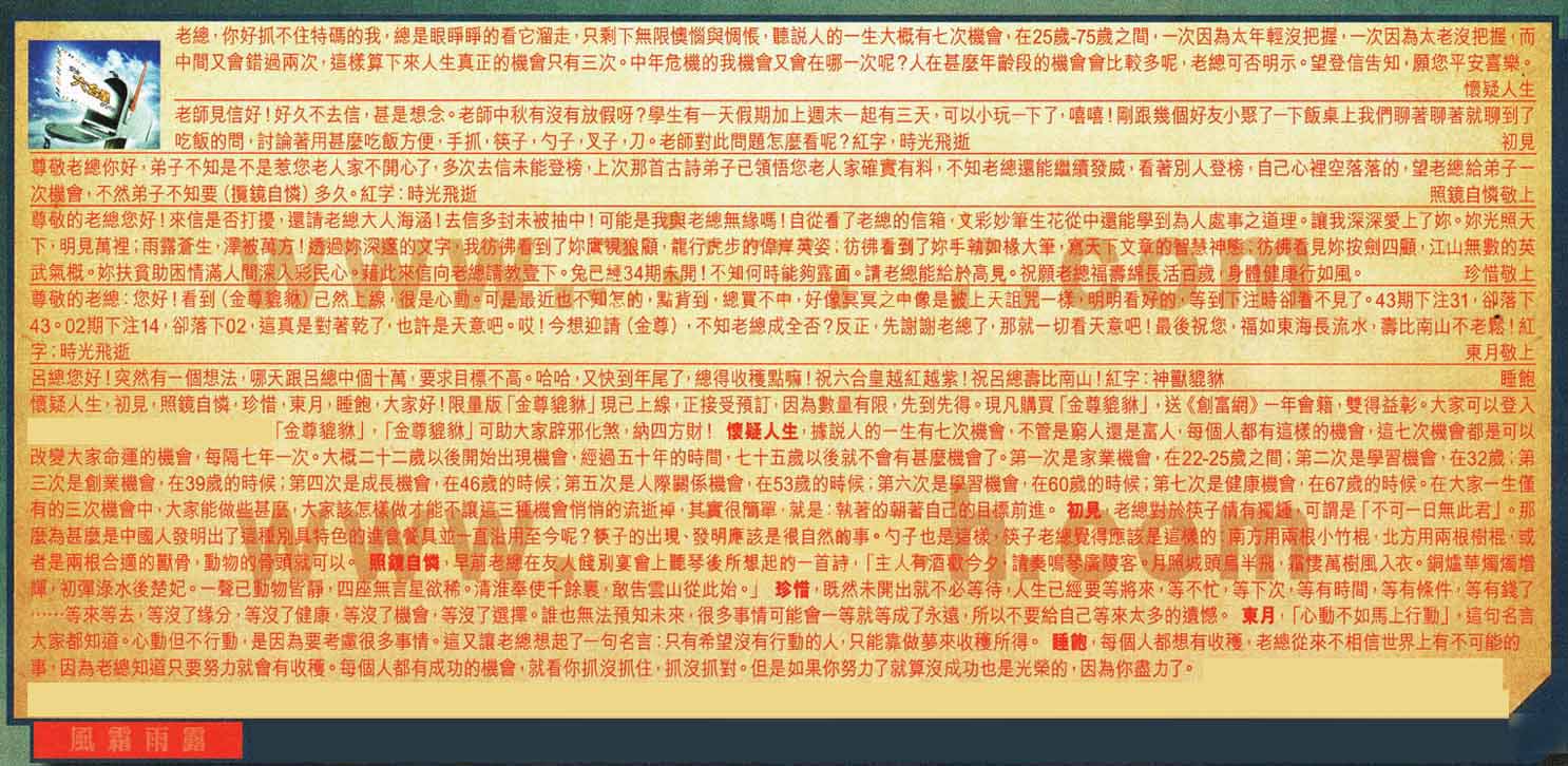 【3】.尊敬老總你好,弟子不知是不是惹您老人家不開心了,多次去信未能登榜,上次那首古詩弟子已領悟您老人家確實有料,不知老總還能繼續發威,看著別人登榜,自己心裡空落落的,望老總給弟子一次機會,不然弟子不知要(攬鏡自憐)多久。紅字:時光飛逝 照鏡自憐敬上