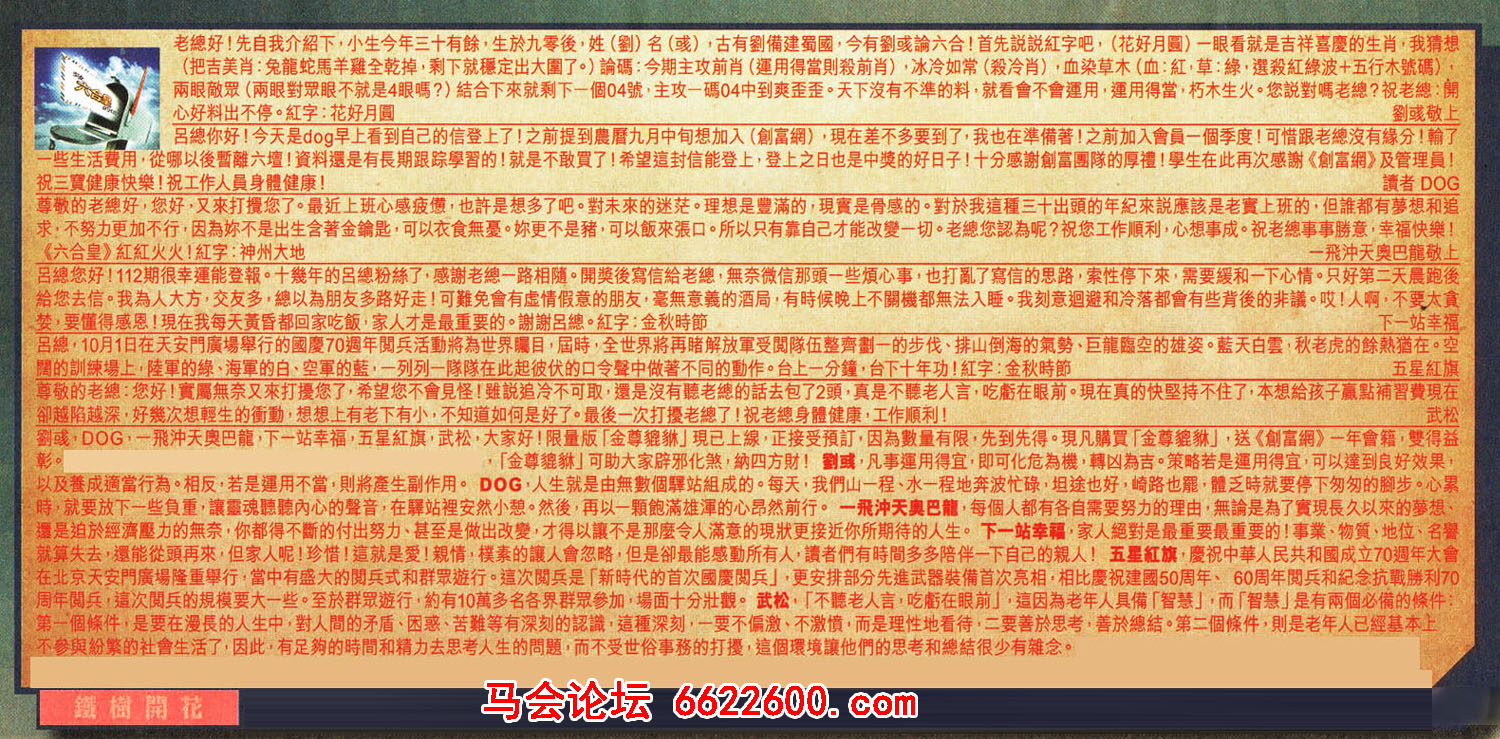 【4】.呂總您好!112期很幸運能登報。十幾年的呂總粉絲了,感謝老總一路相隨。開獎後寫信給老總,無奈微信那頭一些煩心事,也打亂了寫信的思路,索性停下來,需要緩和一下心情。只好第二天晨跑後給您去信。我為人大方,交友多,總以為朋友多路好走!可難免會有虛情假意的朋友,毫無意義的酒局,有時候晚上不關機都無法入睡。我刻意迴避和冷落都會有些背後的非議。哎!人啊,不要太貪婪,要懂得感恩!現在我每天黃昏都回家吃飯,家人才是最重要的。謝謝呂總。紅字:金秋時節 下一站幸福