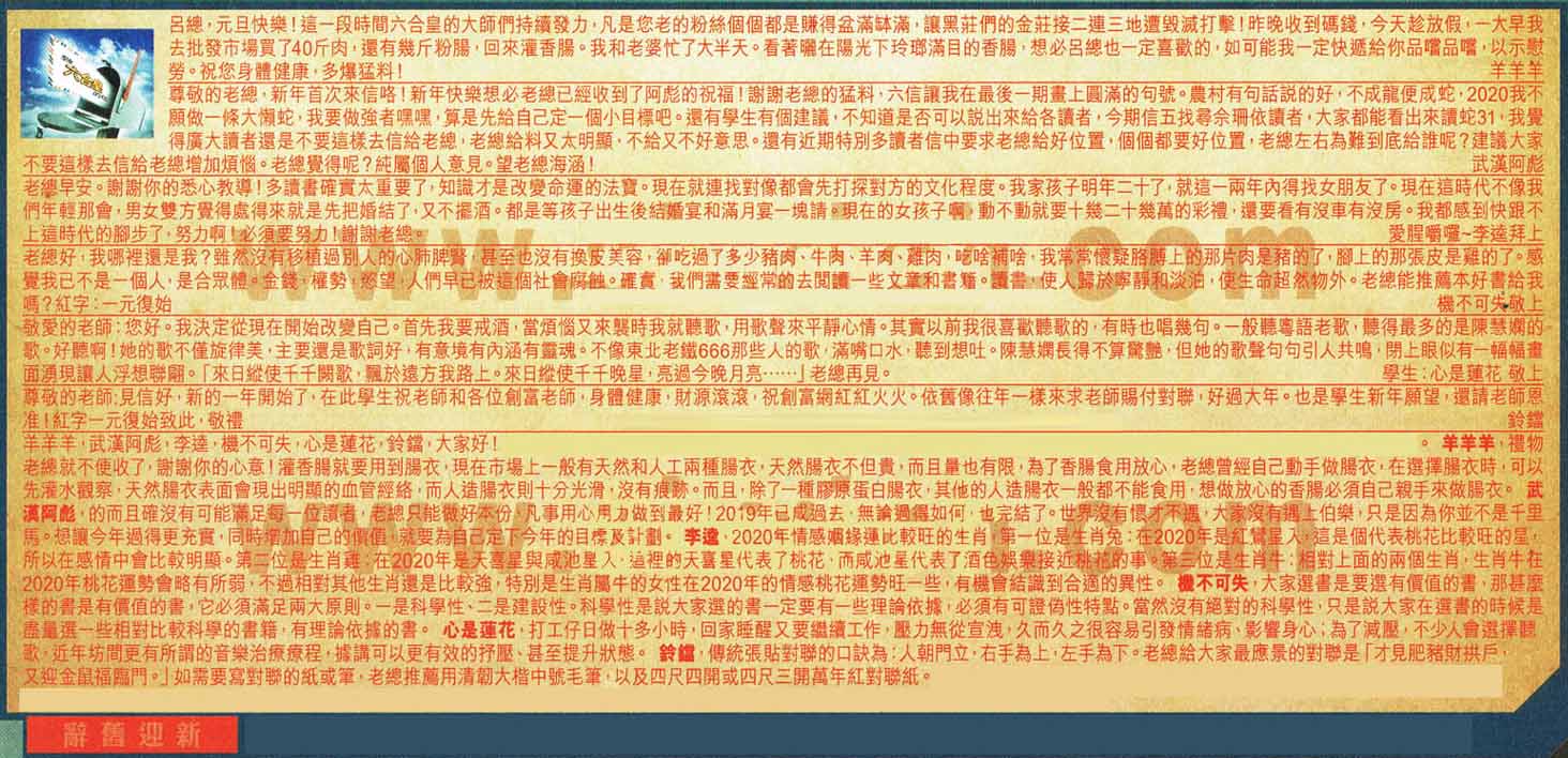 【2】尊敬的老總,新年首次來信咯!新年快樂想必老總已經收到了阿彪的祝福!謝謝老總的猛料,六信讓我在最後一期畫 上圓滿的句號。農村有句話說的好,不成龍便成蛇,2020我不願做一條大懶蛇,我要做強者嘿嘿,算是先給自己定一個小目標吧 。還有學生有個建議,不知道是否可以說出來給各讀者,今期信五找尋佘珊依讀者,大家都能看出來讀蛇31;我覺得廣大讀者還是不要這樣去信給老總,老總給料又太明顯,不給又不好意思。還有近期特別多讀者信中要求老總給好位置,個個都要好位置,老總左右為難到底給誰呢?建議大家不要這樣去信給老總增加煩惱。老總覺得呢?純屬個人意見。望老總海涵!-----武漢阿彪