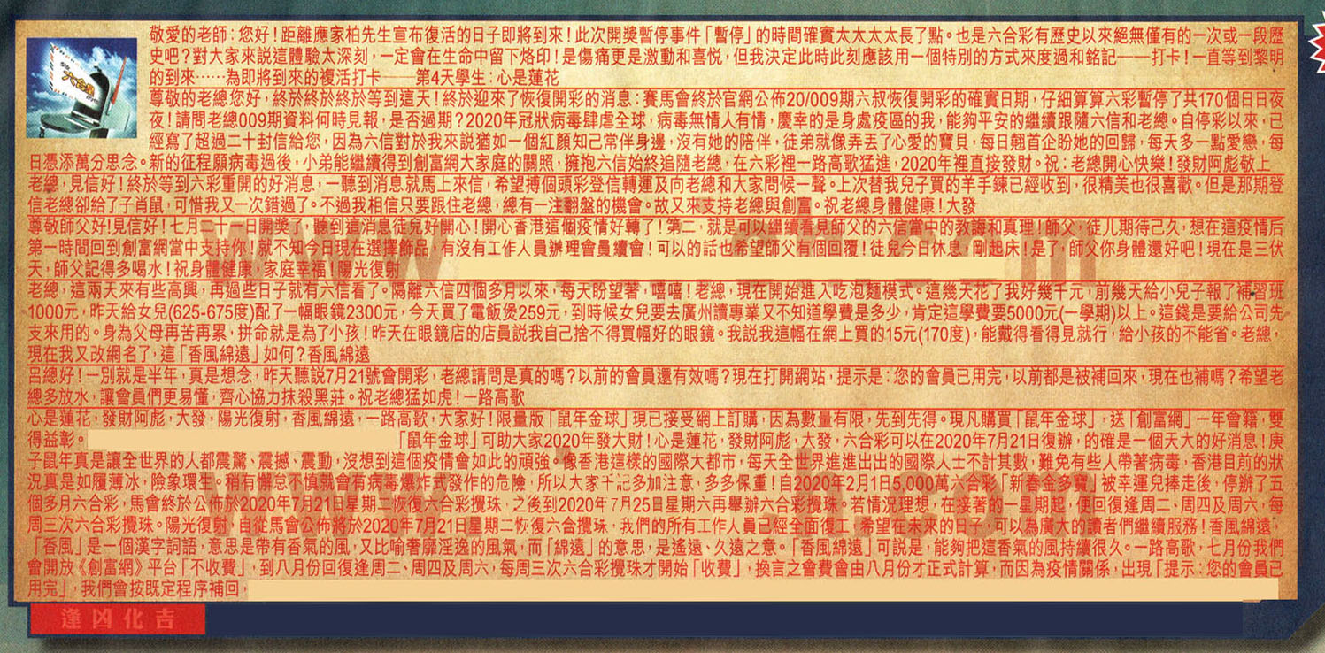 →〖心是蓮花,發財阿彪,大發〗:六合彩可以在2020年7月21日復辦,的確是一個天大的好消息!庚子鼠年真是讓全世界的人都震驚、震撼、震動,沒想到這個疫情會如此的頑強。像香港這樣的國際大都市,每天全世界進進出出的國際人士不計其數,難免有些人帶著病毒,香港目前的狀況真是如履薄冰,險象環生。稍有懈怠不慎就會有病毒爆炸式發作的危險,所以大家千記多加注意,多多保重!自2020年2月1日5,000萬六合彩「新春金多寶」被幸運兒捧走後,停辦了五個多月六合彩,馬會終於公佈於2020年7月21日星期二恢復六合彩攪珠,之後到2020年7月25日星期六再舉辦六合彩攪珠。若情況理想,在接著的一星期起,便回復逢周二、周四及周六,每周三次六合彩攪珠。