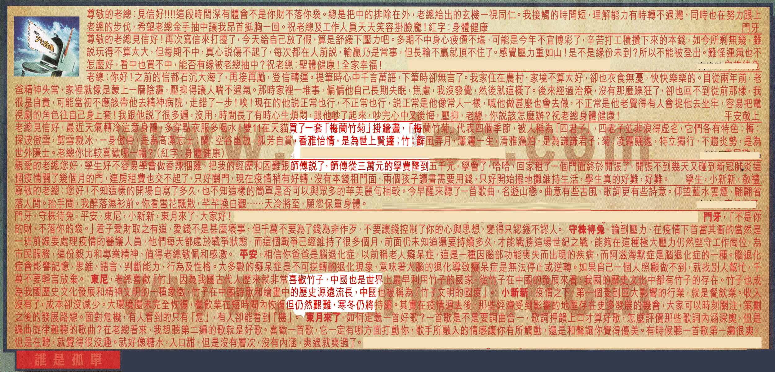 【1】.尊金的老總:見信好!!!!這段時間深有體會不是你財不落你袋。總是把中的排出在外,老總給的玄機一視同仁。我接觸的時間短,理解能力有時轉不過灣,同時也在努力跟上老總的步伐,希望老總金手抽中讓我昂首挺胸一回。祝老總及工作人員天天笑容掛臉龐!紅字:身體健康 門牙