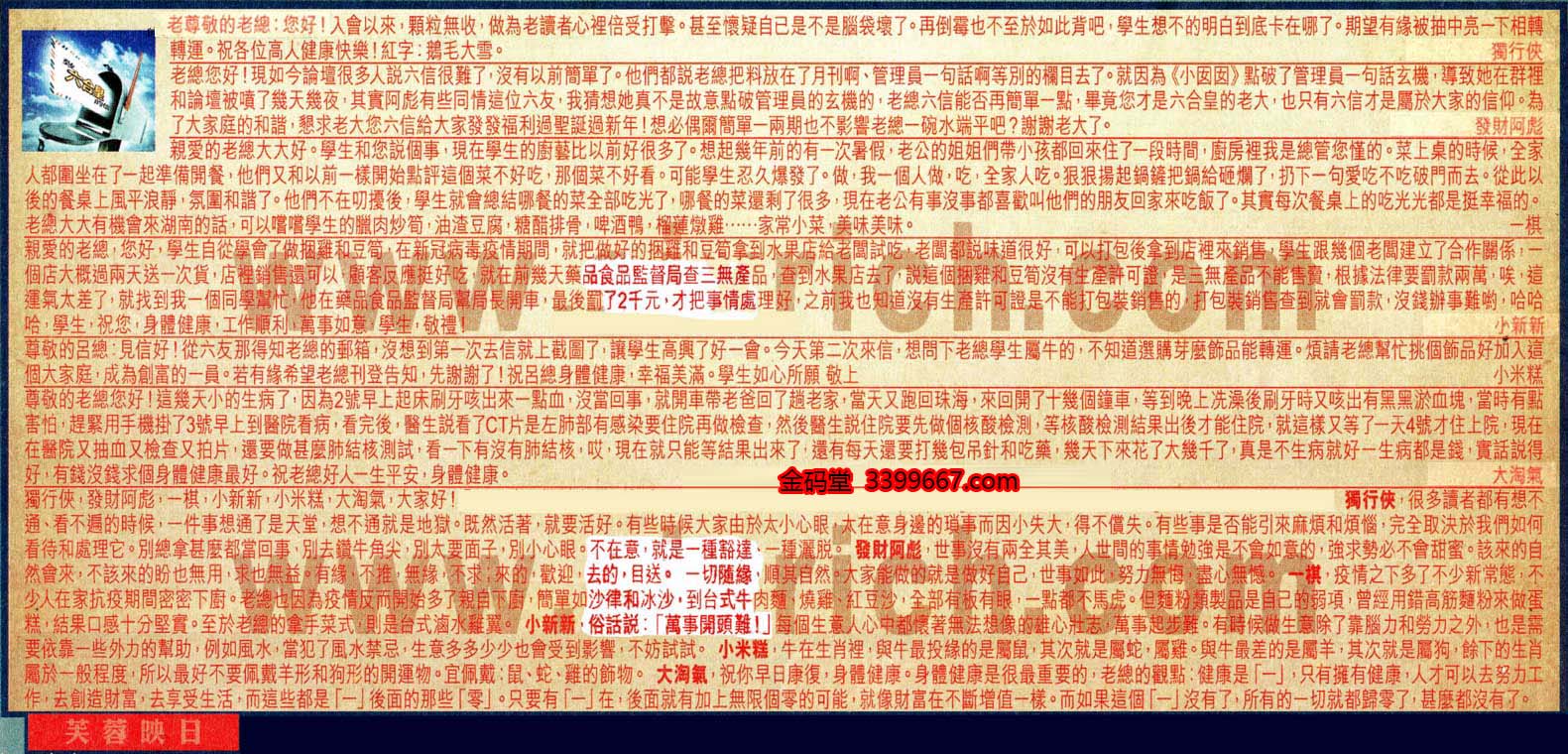 【2】.老總您好!現如今論壇很多人說六信很難了,沒有以前簡單了。他們都說老總把料放在了月刊啊、管理員一句話啊等別的欄目去了。就因為《小囡囡》點破了管理員一句話玄機,導致她在群裡和論壇被嘖了幾天幾夜,其實阿彪有些同情這位六友,我猜想她真不是故意點破管理員的玄機的,老總六信能否再簡單一點,畢竟您才是六合皇的老大,也只有六信才是屬於大家的信仰,為了大家庭的和諧,懇求老大您六信給大家發發福利過聖誕過新年!想必偶爾簡單一兩期也不影響老總一碗水端平吧?謝謝老大了。  發財阿彪