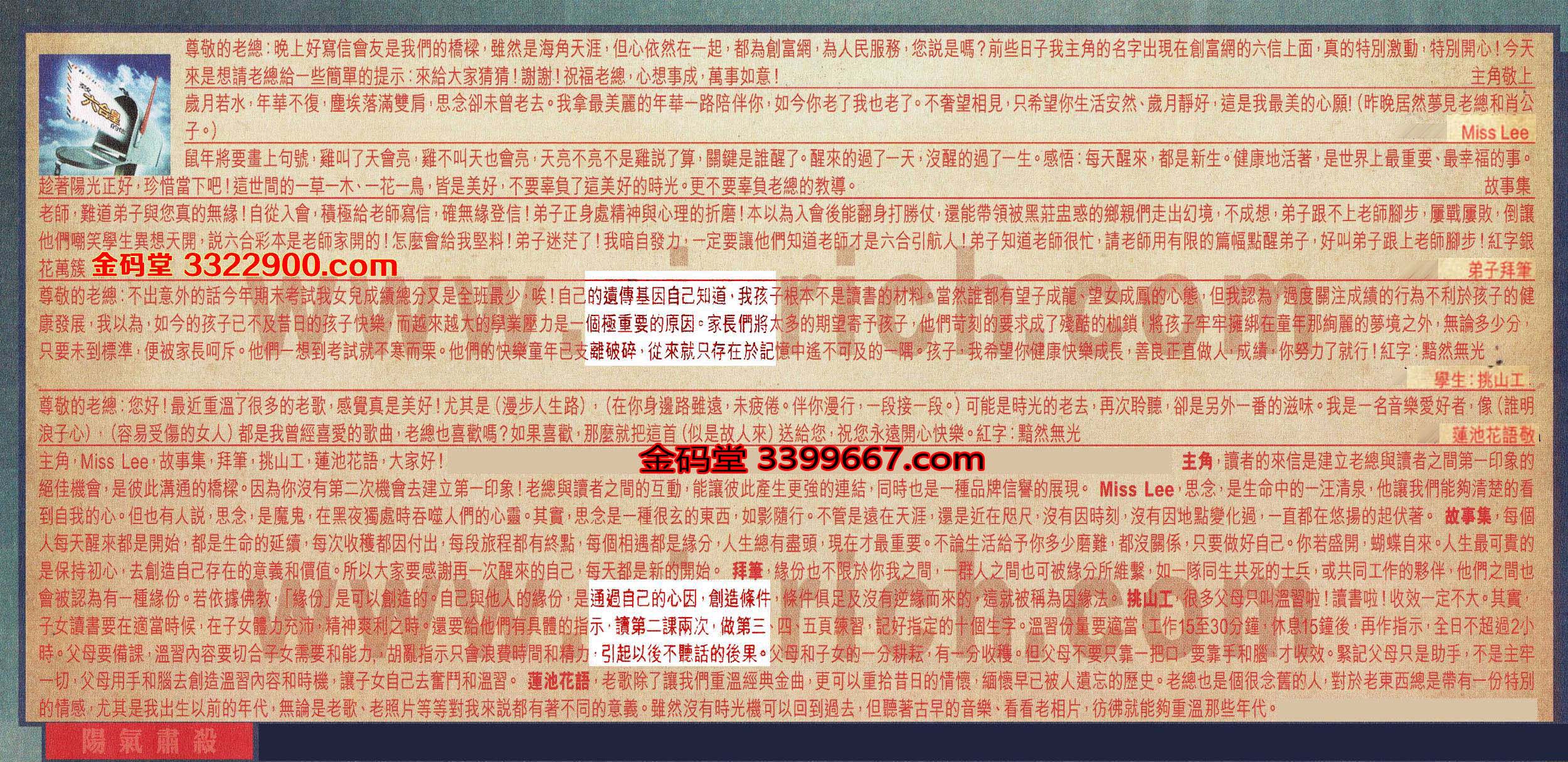 【4】.老師,難道弟子與您真的無緣!自從入會,積極給老師寫信,確無緣登信!弟子正身處精神與心理的折磨!本以為入會後能翻身打勝仗,還能帶領被黑莊盅惑的鄉親們走出幻境,不成想,弟子跟不上老師腳步,屢戰屢敗,倒讓他們嘲笑學生異想天開,說六合彩本是老師家開的!怎麼會給我堅料!弟子迷茫了!我暗自發力,一定要讓他們知道老師才是六合引航人!弟子知道老師很忙,請老師用有限的篇幅點醒弟子,好叫弟子跟上老師腳步!紅字銀花萬簇  弟子拜筆
