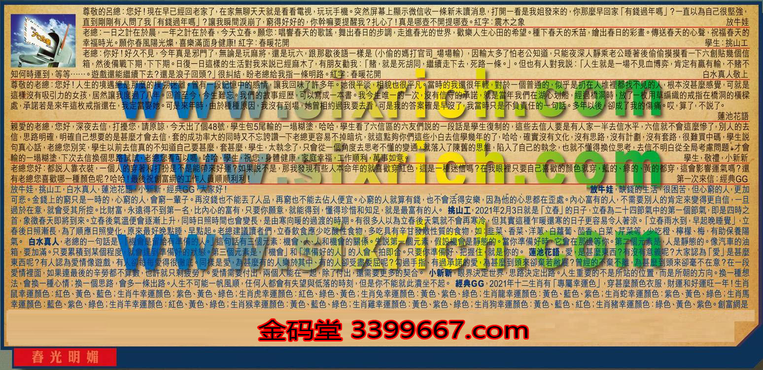 【3】.老總:你好!好久不見,今年真是邪門了,無論是玩麻將,還是玩六,跟那歇後語一樣是(小偷的媽打官司一場場輸),因輸太多了怕老公知道,只能夜深人靜乘老公睡著後偷偷摸摸看一下六創貼幾個信箱,然後備戰下期,下下期。日復一日這樣的生活對我來說已經麻木了,有朋友勸我:「賭,就是死胡同,繼續走下去,死路一條。」但也有人對我說:「人生就是一場不見血博弈,肯定有贏有輸,不賭不知何時運到,等等……。遊戲還能繼續下去?還是浪子回頭?」很糾結,盼老總給我指一條明路。紅字:春暖花開 白水真人敬上