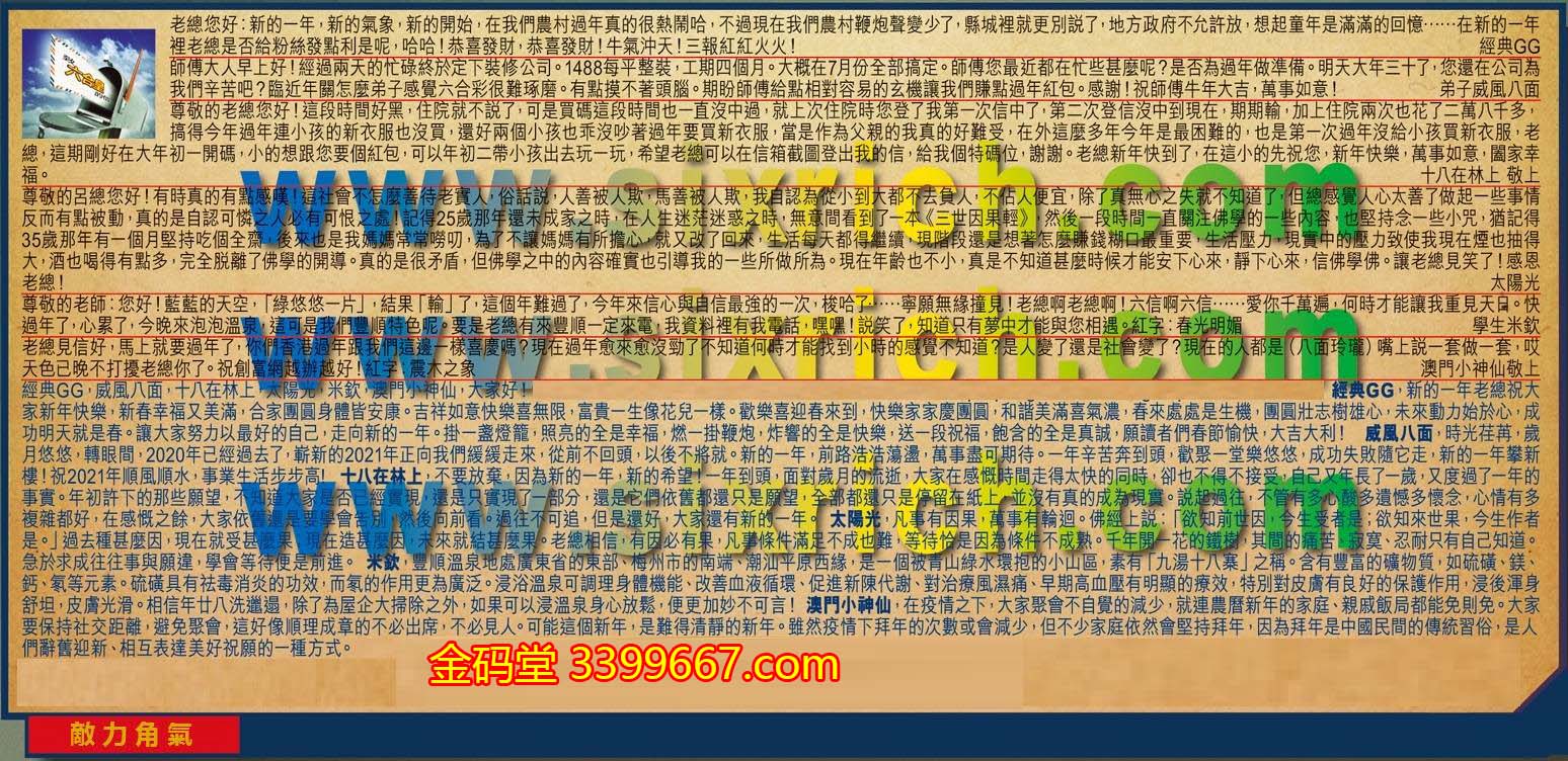 【6】.老總見信好,馬上就要過年了,你們香港過年跟我們這邊一樣喜慶嗎?現在過年愈來愈沒勁了不知道何時才能找到小時的感覺不知道?是人變了還是社會變了?現在的人都是(八面玲瓏)嘴上說一套做一套,哎天色已晚不打擾老總你了。祝創富網越辦越好!紅字:震木之象  澳門小神仙敬上