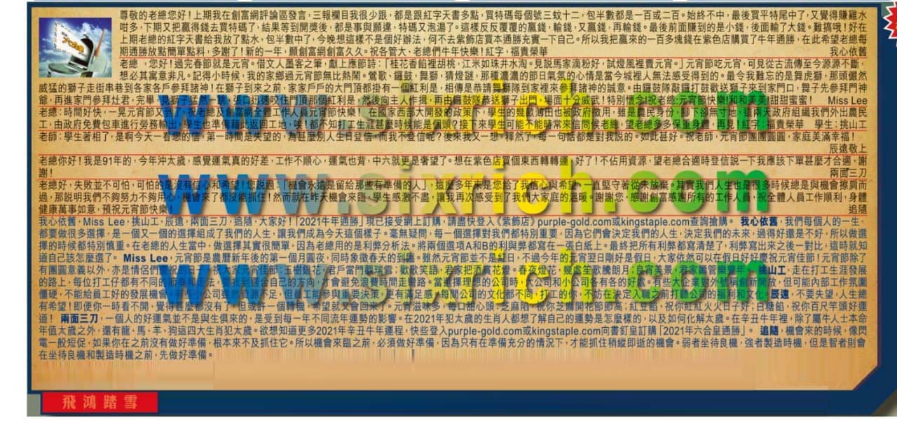 【1】.尊敬的老總您好!上期我在創富網評論區發言,三報欄目我很少跟,都是跟紅字天書多點,買特碼每個號三蚊十二,包半數都是一百或二百。始終不中,最後買平特尾中了,又覺得賺雞水咁多,下期又把赢得錢去買特碼了,結果等到開獎後,都是事與願違,特碼又泡湯了。這樣反反覆覆的贏錢,輸錢,又贏錢,再輸錢。最後前面赚到的是小錢,後面輸了大錢。難搞哦!好在上期老總的紅字天書給我放了點水,包半數中了,今晚想這樣不是個好辦法,何不去紫飾店買本通勝充實一下自己。所以我把赢來的一百多塊錢在紫色店購買了牛年通勝,在此希望老總每期通勝放點簡單點料,多謝了!新的一年,願創富網創富久久。祝各管大、老總們牛年快樂!紅字,福貴榮華  我心依舊