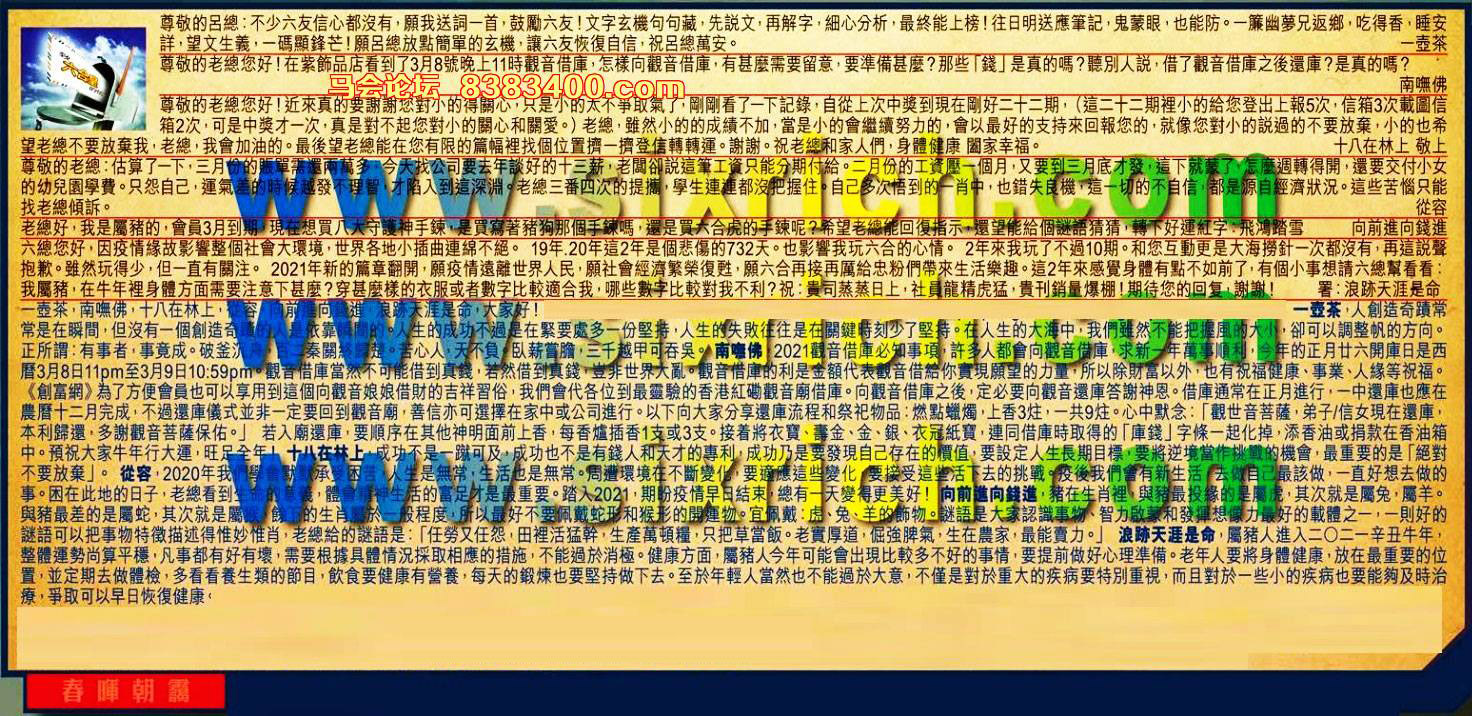 【6】.六總您好,因疫情緣故影響整個社會大環境,世界各地小插曲連綿不絕。19年.20年這2年是個悲傷的732天。也影響我玩六合的心情。2年來我玩了不過10期。和您互動更是大海撈針一次都沒有,再這說聲抱歉。雖然玩得少,但一直有關注。2021年新的篇章翻開,願疫情遠離世界人民,願社會經濟繁榮復甦,願六合再接再厲給忠粉們帶來生活樂趣。這2年來感覺身體有點不如前了,有個小事想請六總幫看看:我屬豬,在牛年裡身體方面需要注意下甚麼?穿甚麼樣的衣服或者數字比較適合我,哪些數字比較對我不利?祝:貴司蒸蒸日上,社員龍精虎猛,貴刊銷量爆棚!期待您的回复,謝謝!  署: 浪跡天涯是命