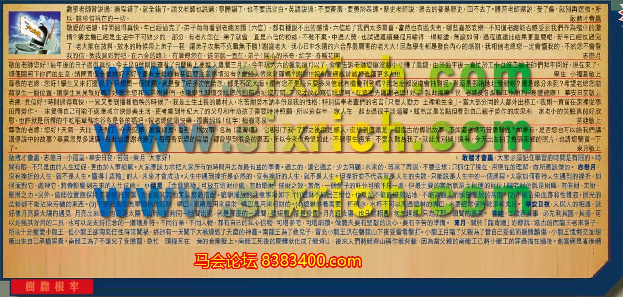 【2】.敬愛的老總,時間過得真快,年已經過完了,弟子每每看到老總回讀〔六信〕,都有種說不出的感情,六信給了我們太多驚喜,當然也有過失敗,哪些喜怒哀樂,不知道老總能否感受到我們作為賭仔的激情?猜玄機已經是生活中不可缺少的一部分,有老大您在,弟子就會一直是六信的粉絲,不離不棄。中過大獎,也試過連續幾個月輸得一塌糊塗,無論如何,過程遠遠比結果更重要吧,新年已經快過完了,老大能在放料,放水的時候帶上弟子一程,讓弟子攻無不克戰無不勝!謝謝老大,我心目中永遠的六合界最厲害的老大大!因為學生都是發自內心的感謝,我相信老總您一定會懂我的,不然您不會登我的信,教我買彩對吧。在六合的路上,有師傅您在,徒弟就一直在,弟子:開心的米奇,紅字,春暖花開  志戀月