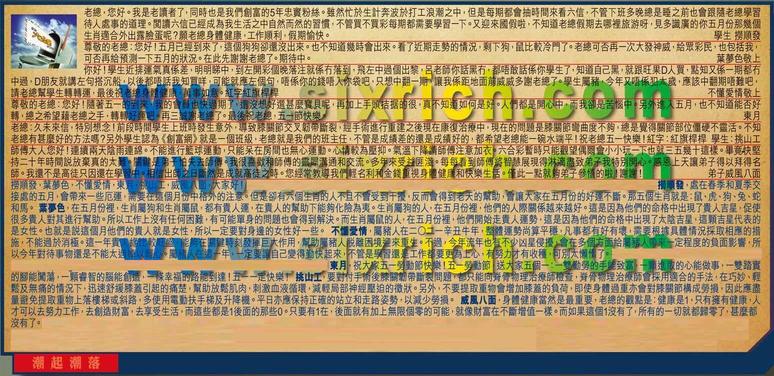 【1】.老總,您好。我是老讀者了,同時也是我們創富的5年忠實粉絲。雖然忙於生計奔波於打工浪潮之中,但是每期都會抽時間來看六信,不管下班多晚總是睡之前也會跟隨老總學習待人處事的道理。閱讀六信已經成為我生活之中自然而然的習慣,不管買不買彩每期都需要學習一下 。又迎來國假啦,不知道老總假期去哪裡旅游呀,見多識廣的你五月份那幾個生肖適合外出露臉蛋呢?願老總身體健康,工作順利,假期愉快。  學生 撈順發
