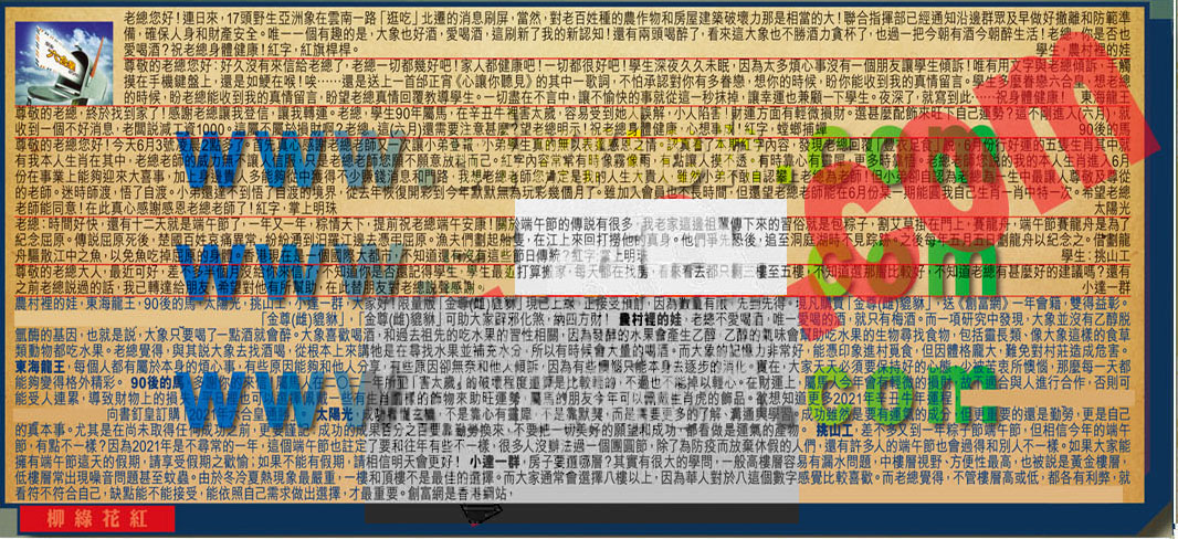 【4】.尊敬的老總您好!今天6月3號凌晨2點多了。首先真心感謝老總老師又-次讓小弟登報,小弟學生真的無以表達感恩之情。認真看了本期紅字内容,發現老總回覆「 豐衣足食」說,6月份行好運的五售生肖其中就有我本人生肖在其中,老總老師的威力無不讓人信服,只是老總老師您願不願意放料而已。紅字内容常常有時像霧像雨,有點讓人摸不透。有時靠心有露犀,更多時靠悟。老總老師您說的我的本人生肖進入6月份在事業上能夠迎來大喜事,加上身邊貴人多能夠從中獲得不少賺錢消息和門路,我想老總老師您肯定是我的人生大貴人,雖然小弟不敢自認攀上老總為老師!但小弟卻自認為老總為一生中最讓人尊敬及尊從的老師。迷時師渡,悟了自渡。小弟還達不到悟了自渡的境界,從去年恢復開彩到今年默默無為玩彩幾個月了。雖加入會員也不長時間,但還望老總老師能在6月份某一期能圓我自己生肖一肖中特一次。 希望老總老師能同意!在此真心感謝感恩老總老師了!紅字,掌上明珠  太陽光