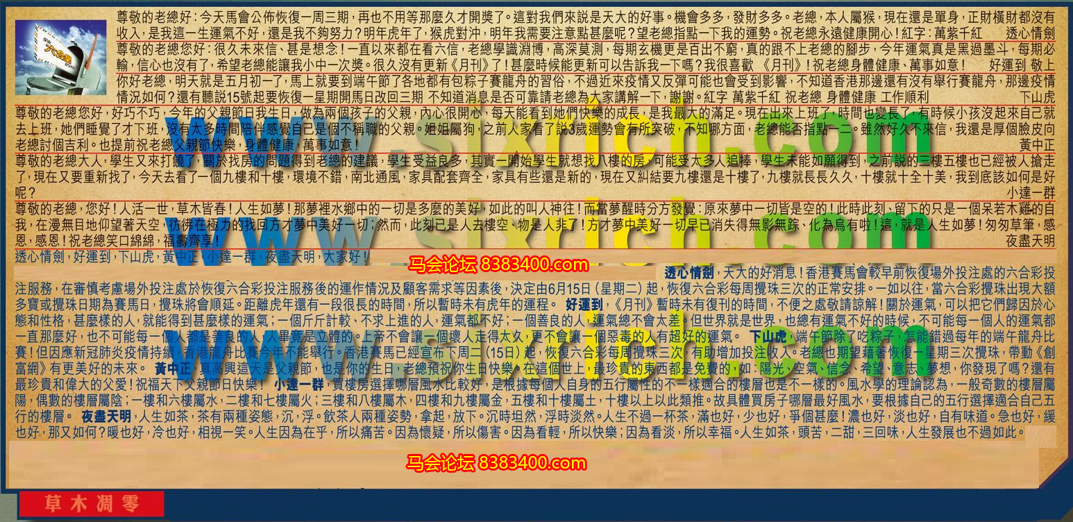 【2】.尊敬的老總您好:好久未來信、甚是想念!一直以來都在看六信,老總學識淵博,高深莫測,每期玄機更是百出不窮,真的跟不上老總的腳步,今年運氣真是黑過墨斗,每期必輸,信心也沒有了,希望老總能讓我小中一次獎。很久沒有更新《月刊》了!甚麼時候能更新可以告訴我一下嗎?我很喜歡《月刊》!祝老總身體健康、萬事如意!  好運到  敬上