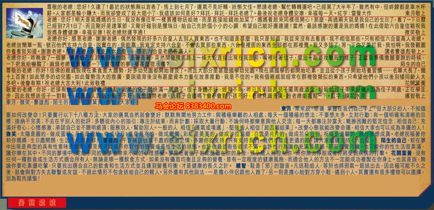 【1】.尊敬的老總:您好!久違了!最近的狀態無以言表了,馬上到七月了,運氣不見好轉,狀態欠佳。懇請老總,幫忙轉轉運吧。已經黑了大半年了,雖然有中,但終歸都是車水杯薪。人家都是輸小嫌大,而我卻變成了殺大賠小了,我這該如何是好?拜託,拜託,拜託老總了。最後祝老總身體安康,幸福每一天。紅字:雷聲大作  東月敬上