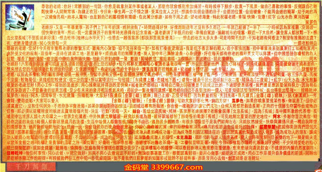 【4】.老總好!六彩從新回來後可能是太久沒看的原因,跟不上您的腳步。恰巧有群友鳳姐貼心看讀者論壇很有一套,所以就跟著他們,把重心轉移了。無奈成績還是差,只是續會後才稍有起色。想來想去您的六信還是比較適合自己的,又拿起來看了。希望能被您的金手抽中,讓我露面而扭轉氣運。祝老總身體健康,一生幸福!  認曾學習