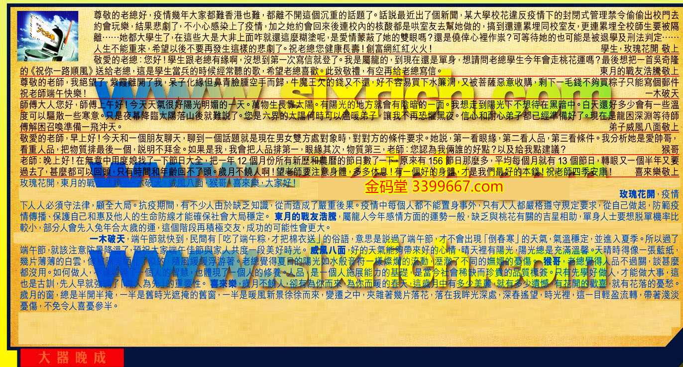 【1】.尊敬的老總好,疫情幾年大家都難香港也難,都離不開這個沉重的話題了。話說最近出了個新聞,某大學校花違反疫情下的封閉式管理禁令偷偷出校門去約會玩樂,結果悲劇了,不小心感染上了疫情,加之她約會回來後連校內的核酸都是哄室友去幫她做的,搞到還連累埋同校室友,更連累埋全校師生要被隔離......她都大學生了,在這些大是大非上面咋就還這麼糊塗呢,是愛情蒙蔽了她的雙眼嗎?還是僥倖心裡作祟?可等待她的也可能是被退學及刑法判定......人生不能重來,希望以後不要再發生這樣的悲劇了。祝老總您健康長壽!創富網紅紅火火!  學生 玫瑰花開 敬上
