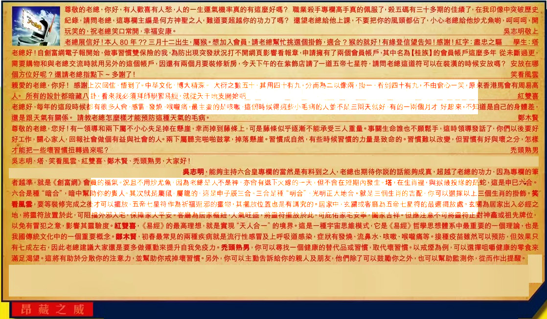 【2】.老總展信好!本人 80 年??三月十二出生,屬猴。想加入會員,請老總幫忙挑選個掛飾,適合?猴的就好!有緣登信望告知!感謝!紅字:盡忠之驅 學生:塔