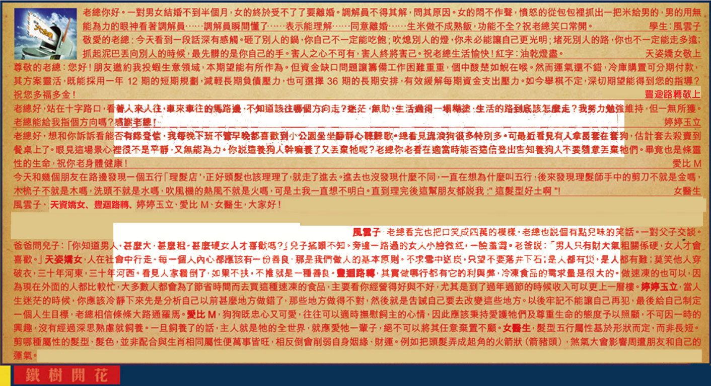 001期:彩民推荐六合皇信箱(紅字:鐵樹開花)