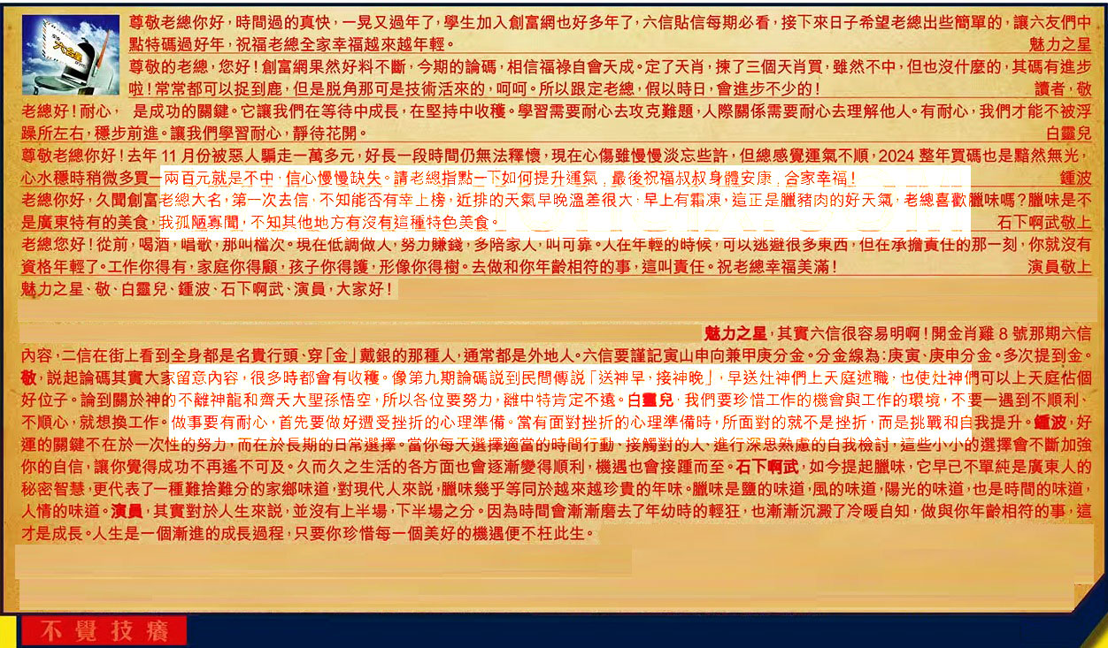 【1】.尊敬老總你好,時間過的真快,一晃又過年了,學生加入創富網也好多年了,六信貼信每期必看,接下來日子希望老總出些簡單的,讓六友們中點特碼過好年,祝福老總全家幸福越來越年輕。 魅力之星