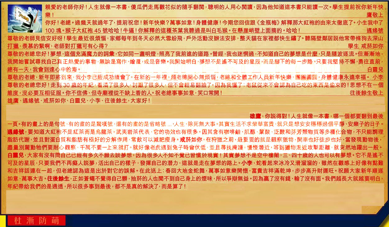 【1】.親愛的老師你好!人生就像一本書,傻瓜們走馬觀花似的隨手翻閱,聰明的人用心閱讀,因為他知道這本書只能讀一次。 學生提前祝你新年快樂! 鷹敬上