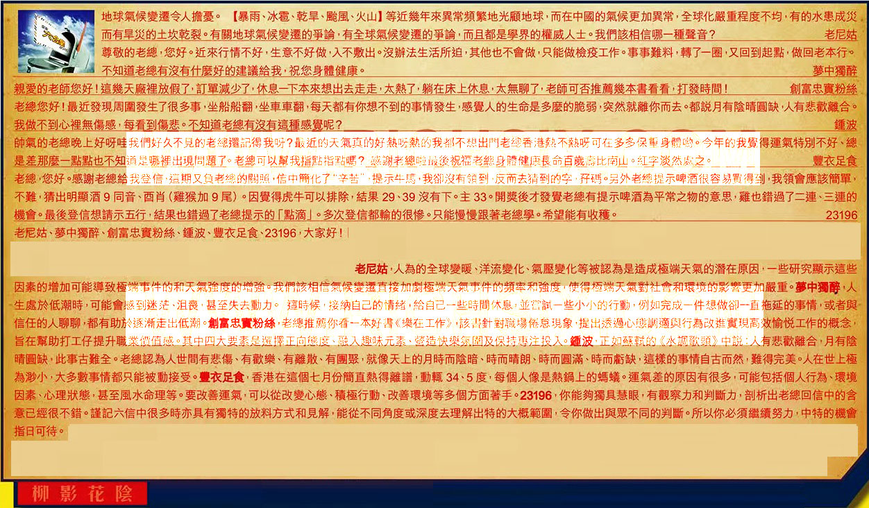 【6】.老總,您好感謝老總給我登信,這期又負老總的關照,信中商化了“辛苦”,提示牛馬,我卻沒有領到,反而去猜到的字孖碼。另外老總提示啤酒很容易買得到,我領會應該簡單,不難,猜出明顯酒9同音、酉肖(雞猴加9尾)。因覺得虎牛可以排除,結果29、39沒有下。主33。開獎後才發覺老總有提示啤酒為平常之物的意思,雞也錯過了二連、三連的機會。最後登信想請示五行,結果也錯過了老總提示的「點滴」。多次登信都輸的很惨。只能慢慢跟著老總學。希望能有收穫。 23196