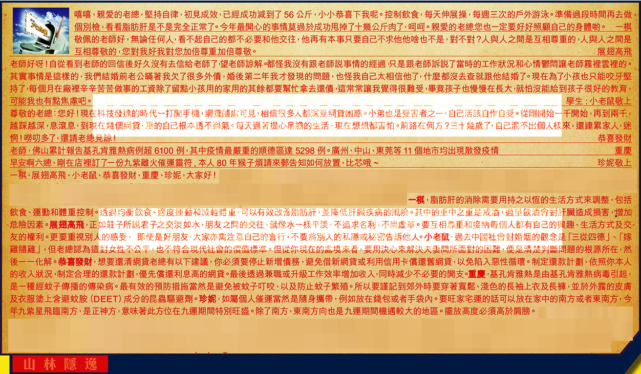 【3】.老師好呀!自從看到老師的回信後好久沒有去信給老師了望老師諒解。嘟怪我沒有跟老師說事情的經過,只是跟老師訴說了當時的工作狀況和心情鬱悶讓老師霧裡雲裡的。其實事情是這樣的,我們結婚前老公瞞著我欠了很多外債,婚後第二年我才發現的問題,也怪我自己太相信他了,什麼都沒去查就跟他結婚了。現在為了小孩也只能咬牙堅持了每個月在廠裡辛辛苦苦做事的工資除了留點小孩用的家用的其餘都要幫忙拿去還債,這常常讓我覺得很難受,畢竟孩子也慢慢在長大,就怕沒能給到孩子很好的教育,可能我也有點焦慮吧。 學生:小老鼠敬上