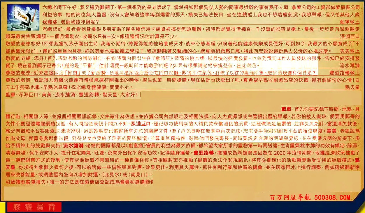 【1】.六總老師下午好:我又遇到難題了,第一個想到的是老師您了,偶然得知那個狗仗人勢的同事最近幹的事有點不人道,拿著公司的工资卻做著損害公司利益的事,她的崗位無人監督,沒有人會知道這事等到爆雷的那天,損失已無法挽回,坐在這艘船上我也不想這艘船沉,我想舉報,但又怕其他人說我雞婆,老師我該咋辦呢? 藍單敬止
